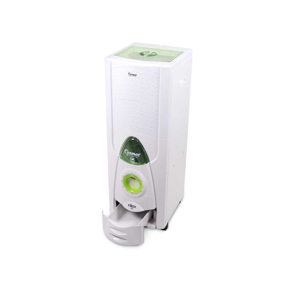 Cosmos rice storage facility with First In First Out technology, where the rice that is put in first will also be taken out first, making the rice healthier and more hygienic. There is a Cakra: a time marker to find out how long the rice is stored, manage monthly expenses for rice, and find out the amount of rice needed for a certain period. Rat-free, rust-free, body made of metal plate. With a storage capacity of 38 Kg. Elegant white color with a combination of blue cover. One pull out 150gr of rice.